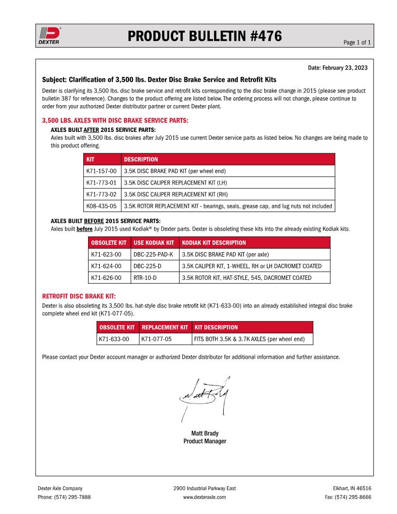476: Clarification of 3,500 lbs. Dexter Disc Brake Service and Retrofit Kits