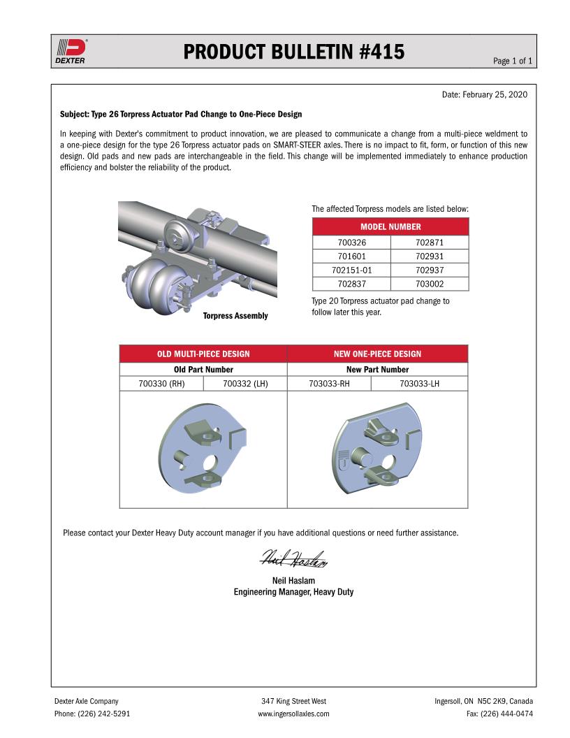 415: Type 26 Torpress Actuator Pad Change to One-Piece Design